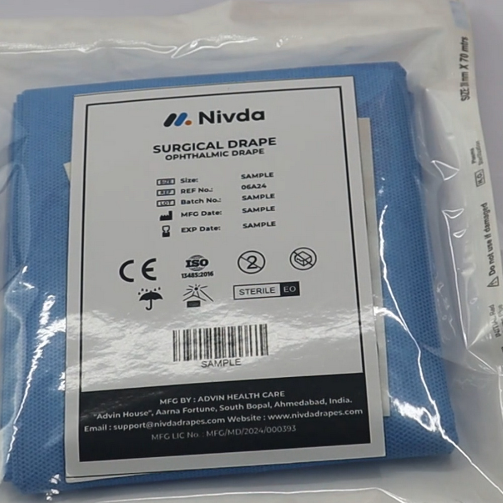 Nivda Drapes Ophthalmic Drapes are carefully developed to meet the needs of delicate eye surgeries. Made from premium non-woven, fluid-resistant material, they ensure excellent barrier protection against contamination. Their design allows precise exposure of the operative site while covering surrounding areas to maintain a sterile field. Ideal for use in ophthalmology units and surgical centers, these drapes enhance infection control, surgical efficiency, and patient comfort during eye procedures.